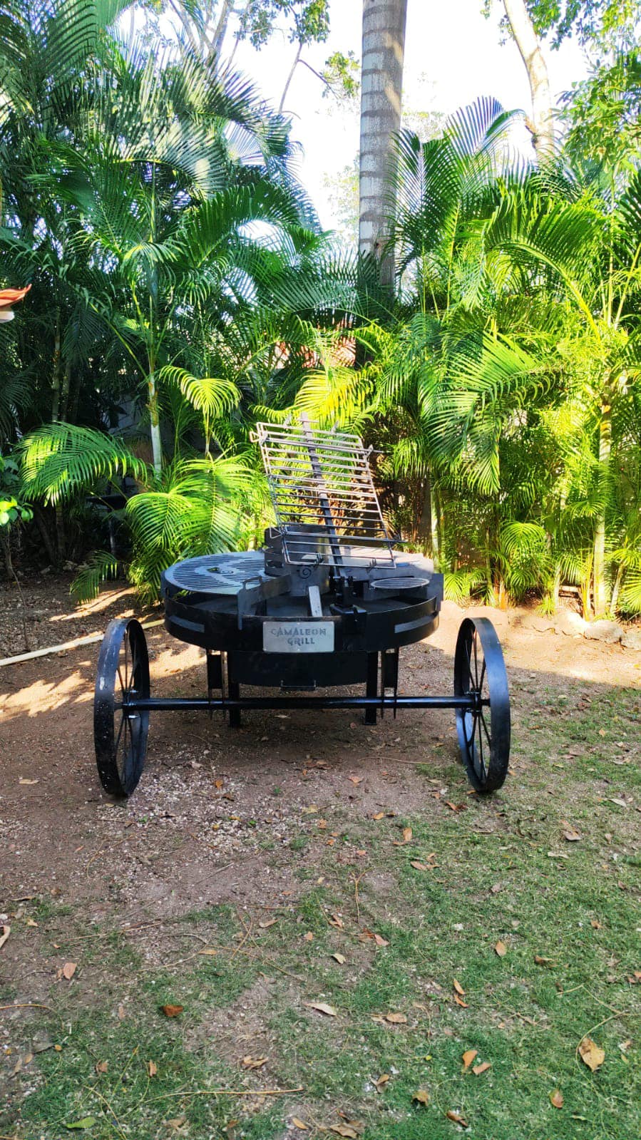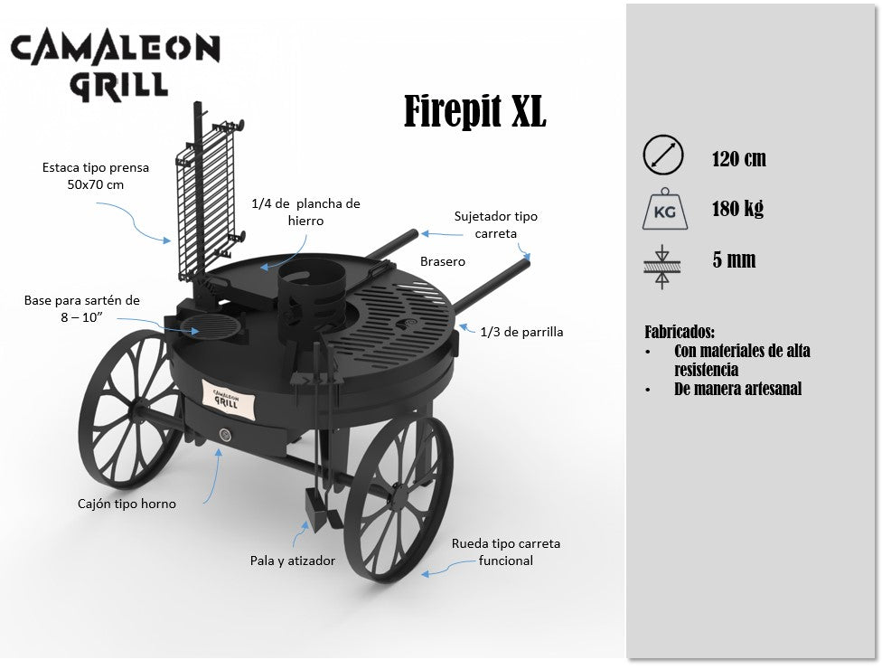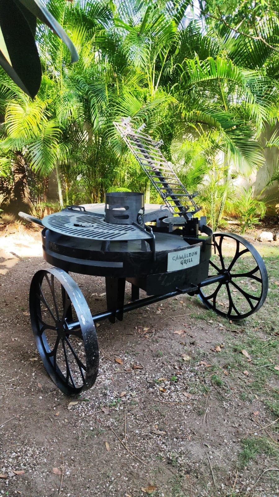 Parrilla estilo fogonero con carreta, fabricado en materiales de alta resistencia.