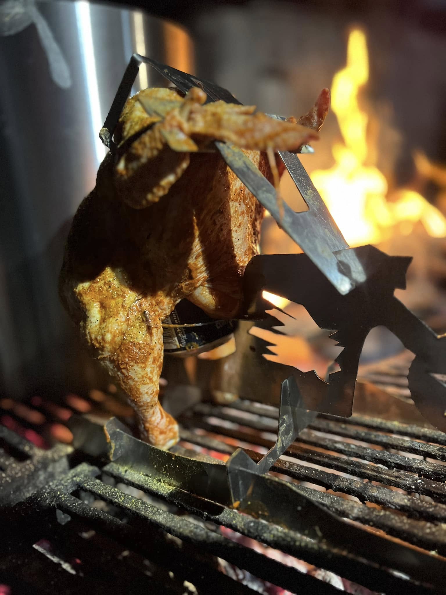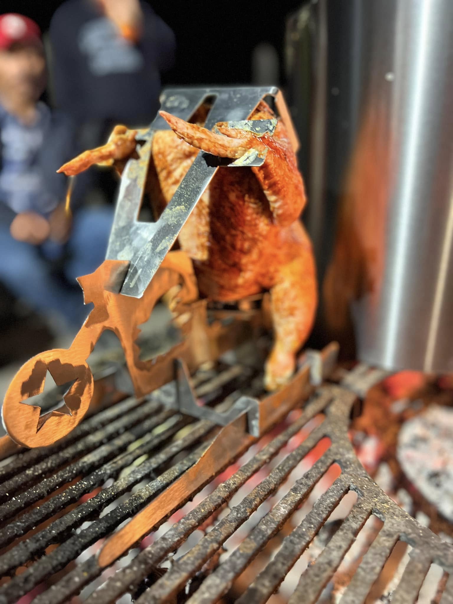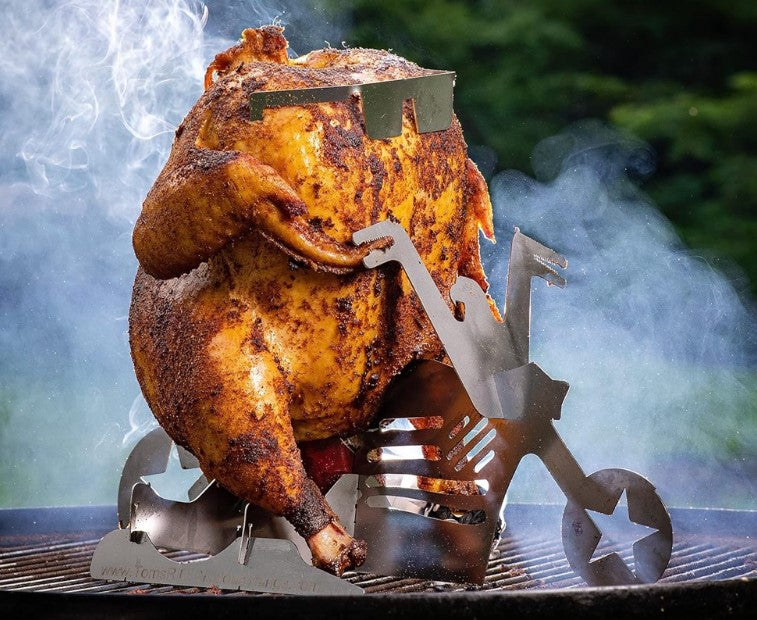 Excelente base para sentar pollos en el grill, evita que se te caiga el pollo al momento de asar en tu grill, fabricado completamente en acero inoxidable grado alimenticio y corte laser.